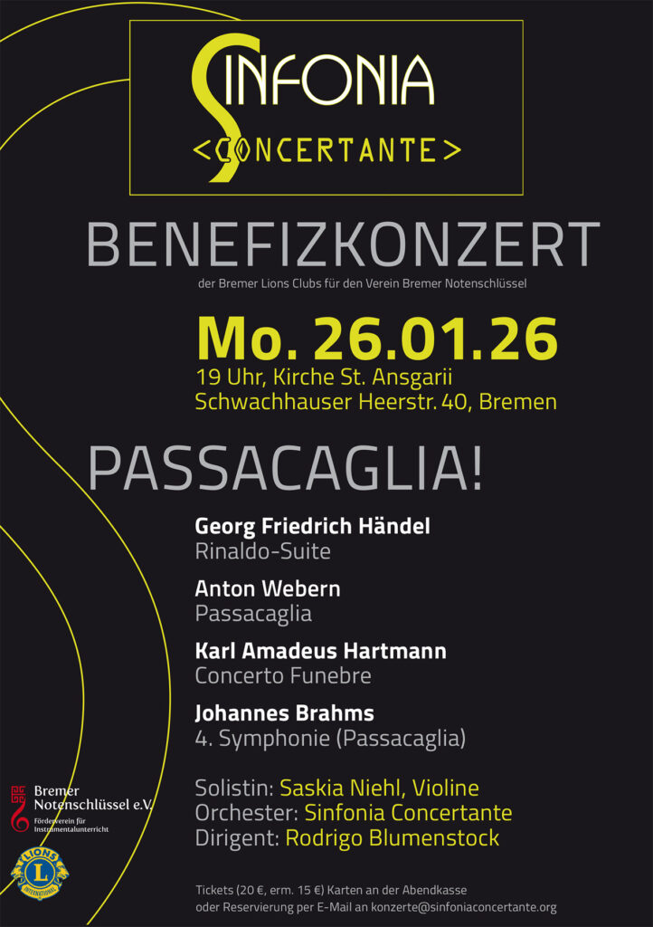 Auf Einladung des Lions Club Bremen gab das Orchester Sinfonia Concertante am 16. Januar 2026 in der St. Ansgarii-Kirche ein Benefizkonzert zugunsten des Bremer Notenschlüssel. Unter dem Dirigenten Rodrigo Blumenstock spielte das Orchester ein sehr interessantes Programm mit vier Werken vom Barock über Moderne bis zur Romantik, zusammengefasst unter dem Titel Passacaglia.